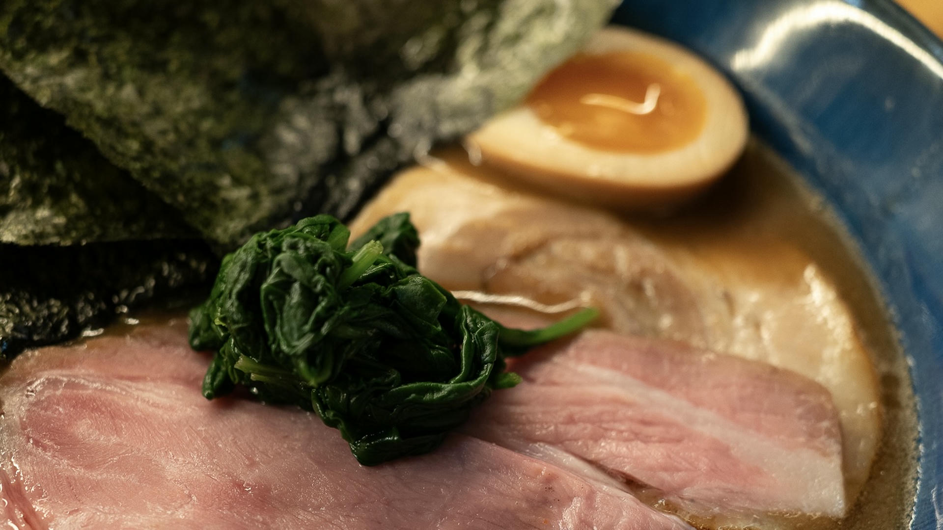 Foamy broth with chicken char siu, seasoned egg, spring onion, black fungus, spinach, sesame seeds, corn & butter, takana and nori